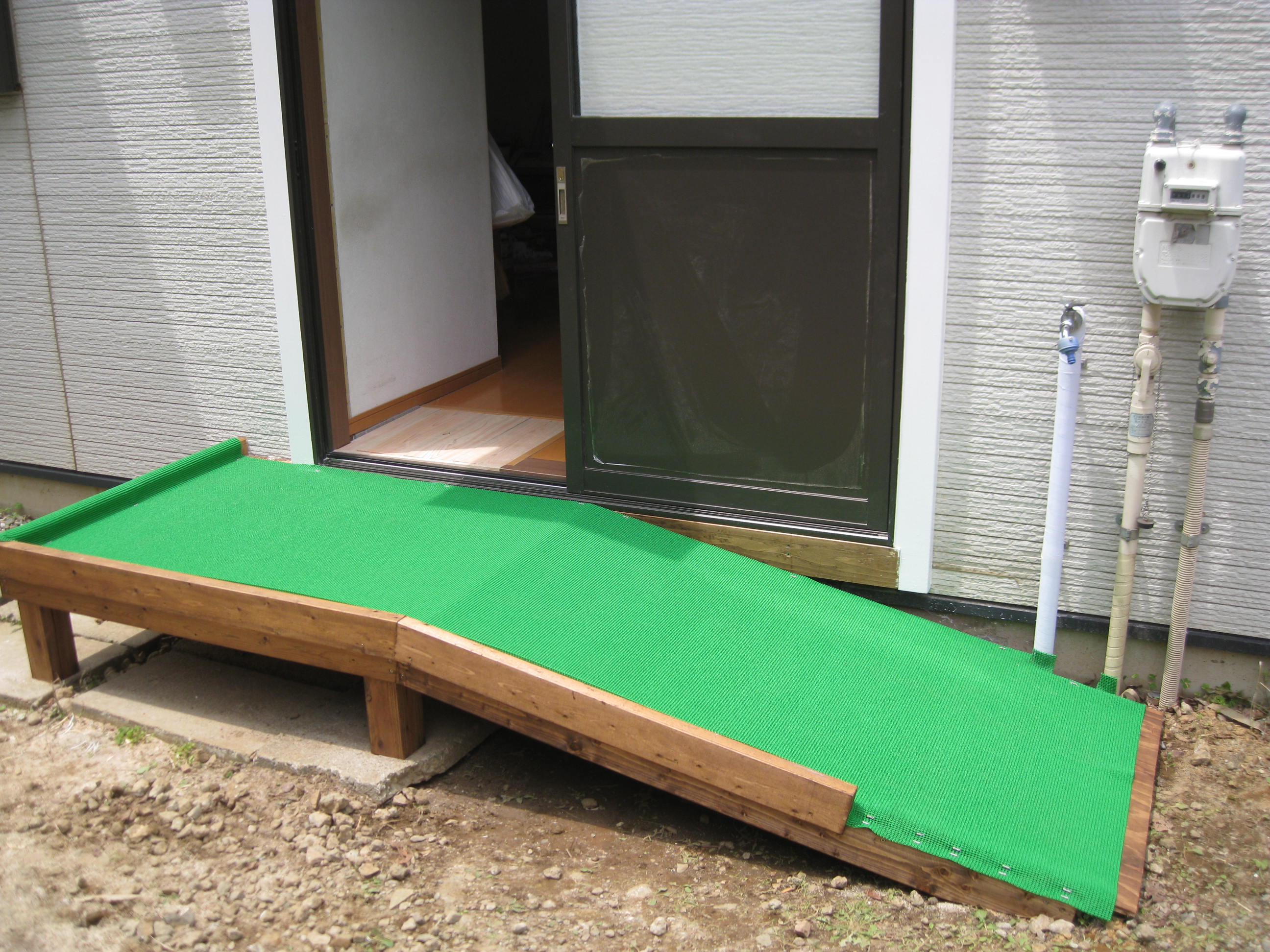ご自宅の玄関の段差を解消しスロープにしませんか? 手すりの取り付けや、ドアを引き戸に変更など、ご相談ください。 補助金申請の書類の作成のお手伝いもいたします。 平成28年3月31日まで着工分まで省エネ住宅ポイントが適用されます。