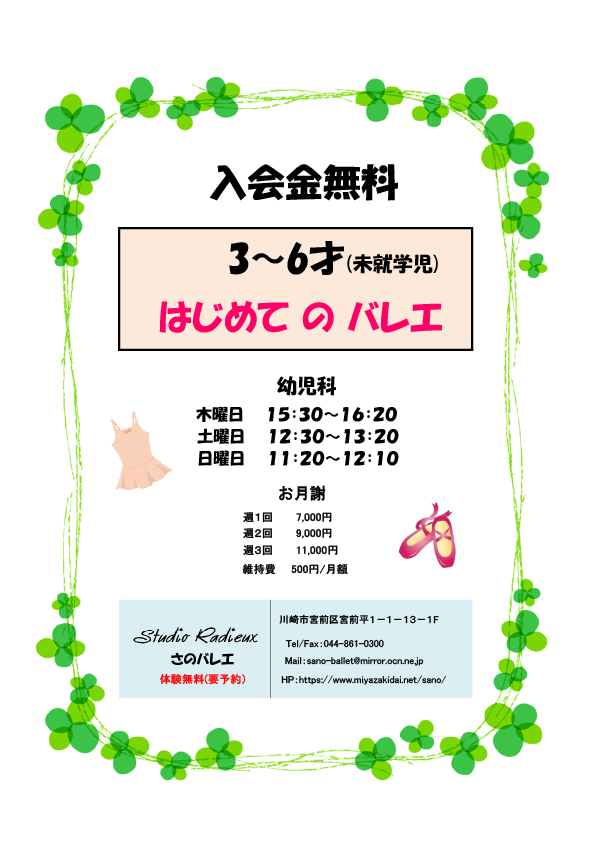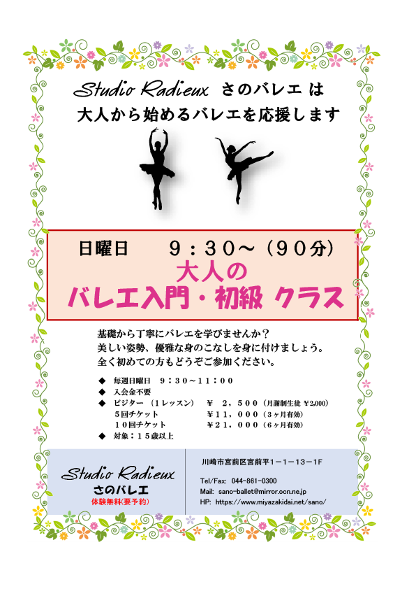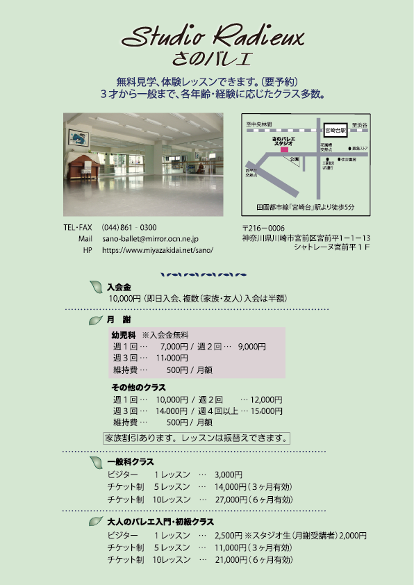レッスン環境の充実をはかる為、2007年 宮崎台に新スタジオをOPENさせました。行き届いた環境・設備の中で、厳しい中にも楽しくのびのびレッスンしています。地域の子供から大人まで、多くの人が通い、親子、姉妹で、またお母さん、娘、孫と3代に渡りさのバレエでレッスンする人も。 バレエはあらゆる踊りの基礎といっても過言ではありません。バレリーナになりたい方はもちろんのこと、美しい動きが要求されるスポーツや、ミュージカルや演劇を学んでいらっしゃる方にも”表現する”という意味でとても役に立ちます。レッスンを通して、精一杯努力すると、次々と新しい世界が広がること、そして、苦労が大きいほどそれを乗り越えた時、自分がひとまわり大きく成長し、楽しさが倍になってくるということを伝えていきたいと考えています。