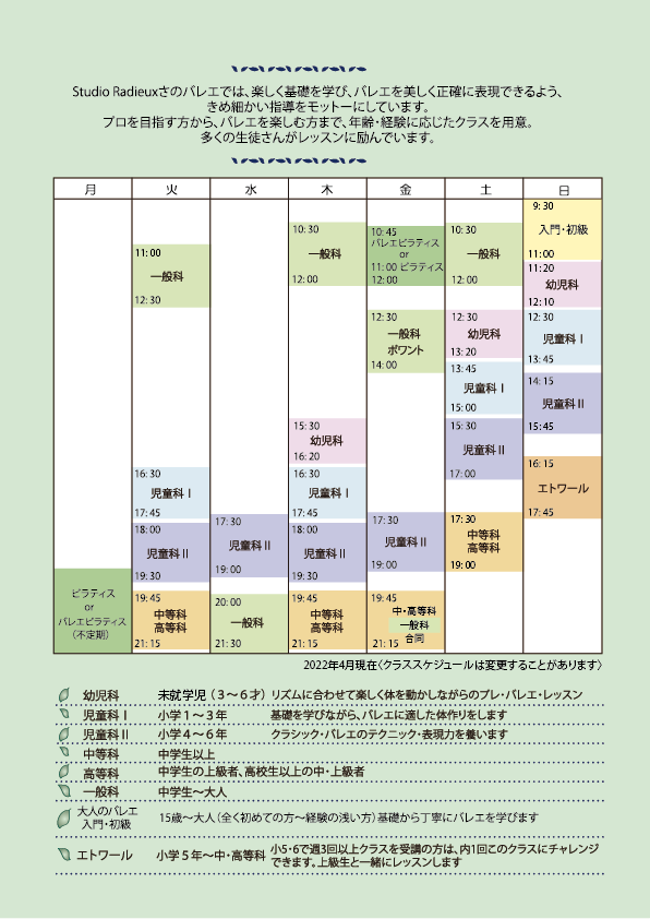 プロのバレエ団経験、豊富な教師経験、現役など多様な教師陣によるレッスンです。 きめ細やかな指導を心がけています。 レッスン時間枠は、各々の年齢、進度に応じて指導できるよう、50分クラスから90分クラスまで多種あります。 一般(大人)の方の為の、初・中・上・ポワントクラスあります。