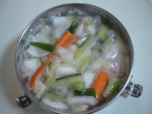 ●水キムチのもとを1リットルのお水で溶かして沸騰させて冷ましておく(つけ汁)