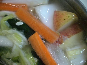 私は人参少し、キュウリ、大根、白菜。以前、りんごの薄切りも本格的かなと思って