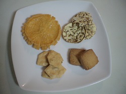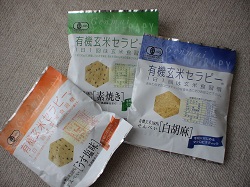 右上から時計回りに、緑豆チップス、玄米クッキー、玄米セラピー、朝日揚げ