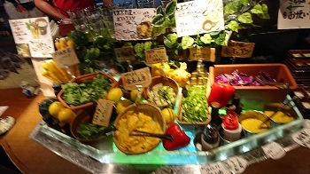 手作りの野菜のおろしドレッシングをつけて、島野菜がとり放題。