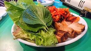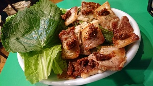 豚の焼き肉。みそ、ねぎ、サンチュと一緒に