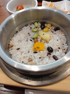 ここは韓国式釜めしのお店で、白米や雑穀米の中に えんどう豆・銀杏・芋・カボチャなどがはいっていて、ガスで炊きます。