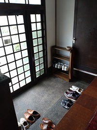 玄関で靴をぬぎ、スリッパに履き替えます