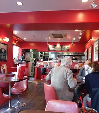 人形町の駅から5分。 アメリカンテイストの真っ赤でおしゃれな外観(中も)