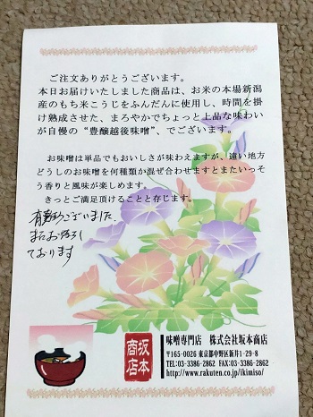 生きてるみそ「味噌専門店 坂本商店」で数種類のお試しを送ってもらいました。